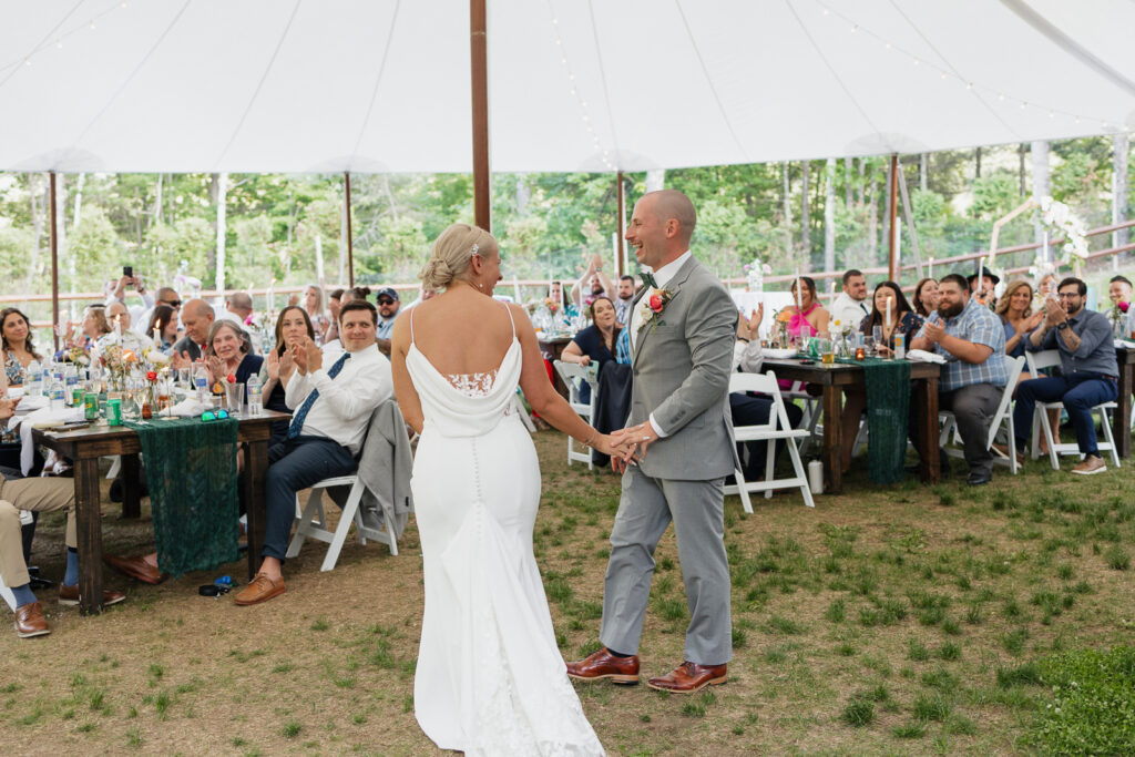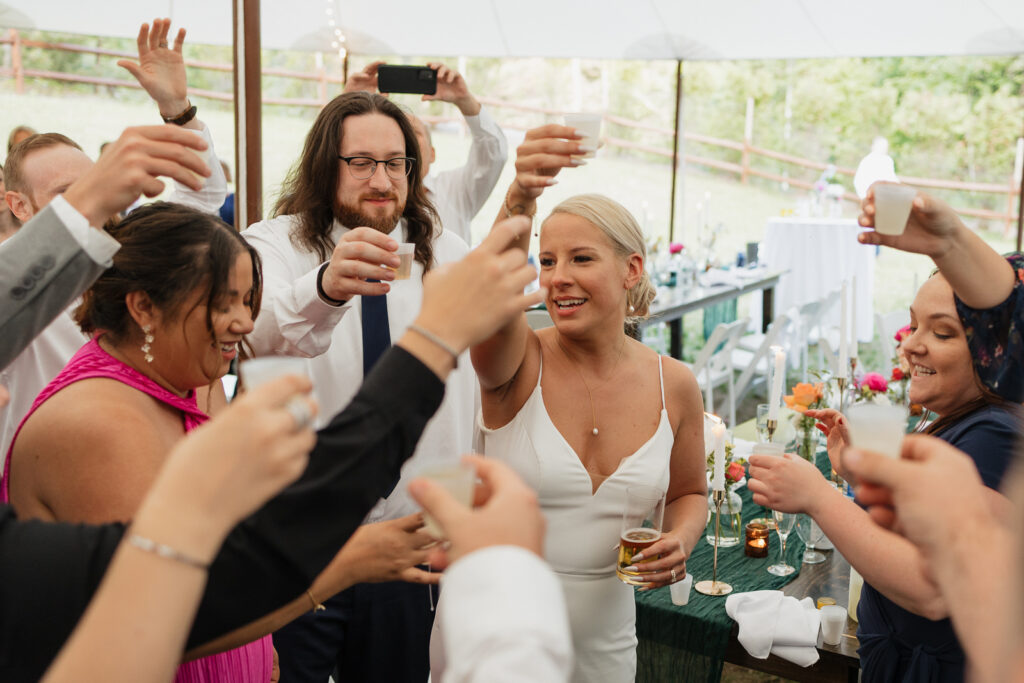 A Lively Reception Full of Celebration Back at the Airbnb, rows of beautifully decorated tables were set up for an intimate and lively reception with their closest friends and family. Kelsey, who had gone barefoot all day was the epitome of carefree. Justin made a fun, energetic entrance, setting the tone for an unforgettable evening. They danced, took celebratory shots, and soaked in every moment of the celebration.