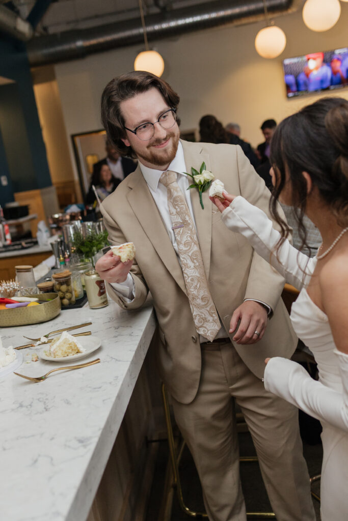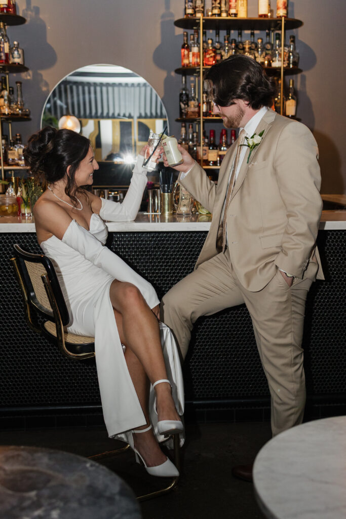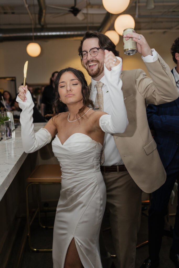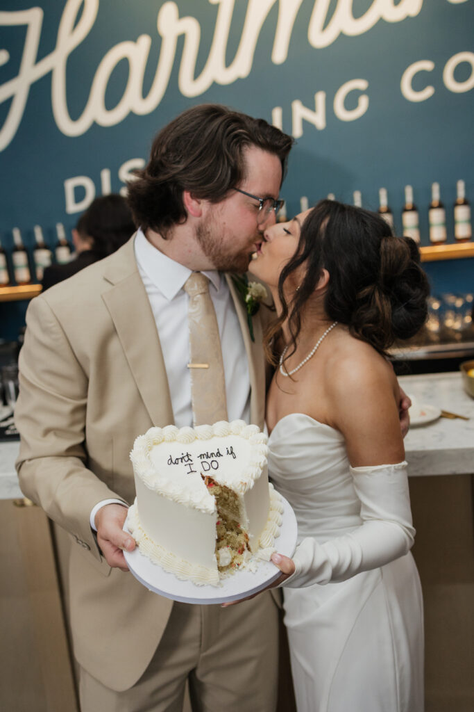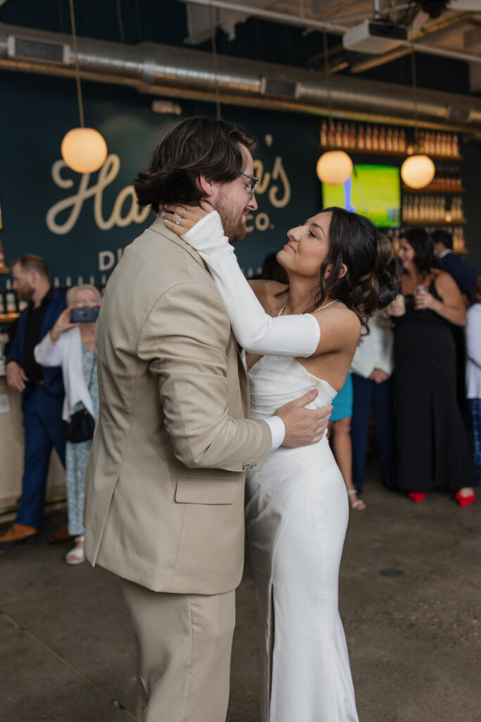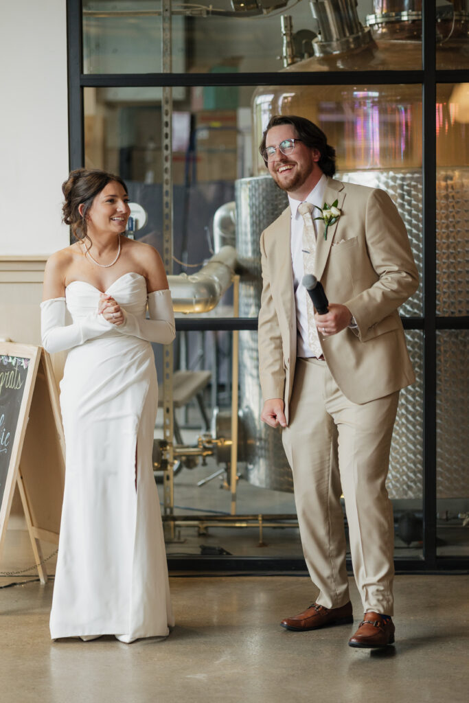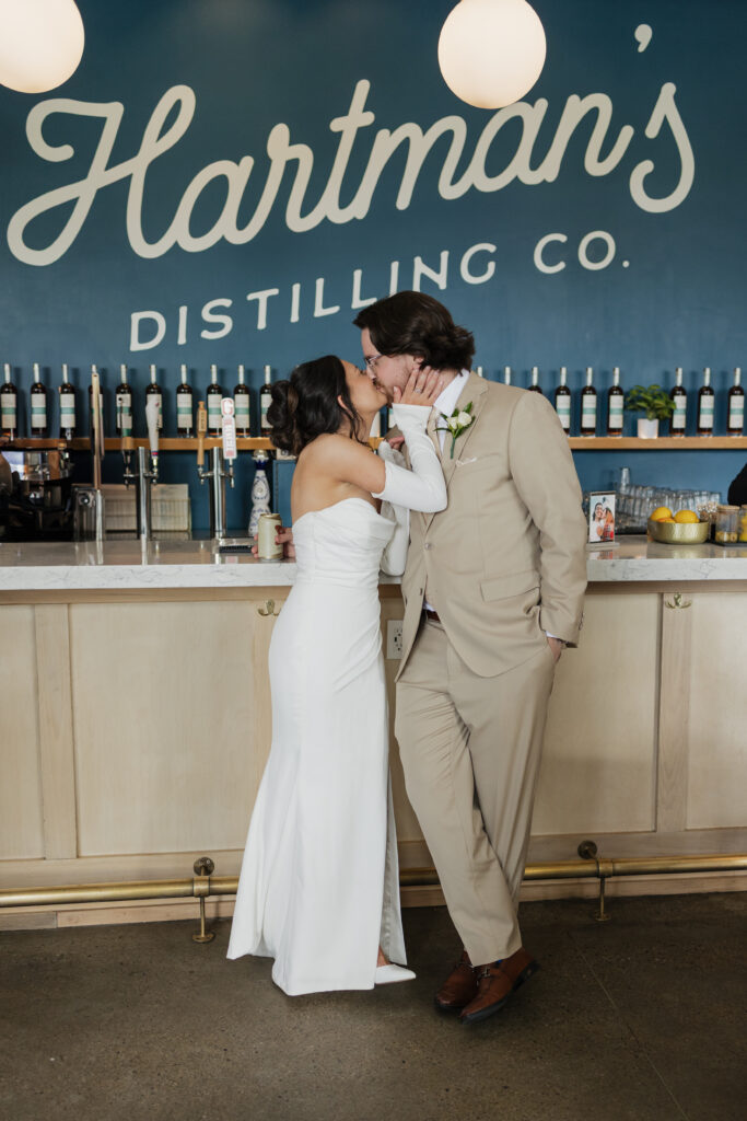 Their reception took place at Hartmann’s Distilling in Buffalo, NY, a modern industrial venue that perfectly matched the laid-back yet intentional vibe of the day. Before guests arrived, we captured portraits throughout the space, including the venue’s hidden speakeasy, which added a fun, moody element to their gallery.